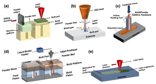 The schematic diagram for (a) LPBF, (b) DED fusion bed AM processing, (c) friction stir AM solid-state processing, (d) binder jet printing mixed-phase AM processing and, (e) laser surface engineering via AM.