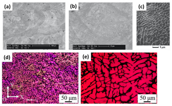 SEM images of LBM-printed (a–c) 18 Ni-300 steel showing finer grains [53]. (d,e) The grain size of the as-deposited and as-cast ALSiMg0.6 [64].