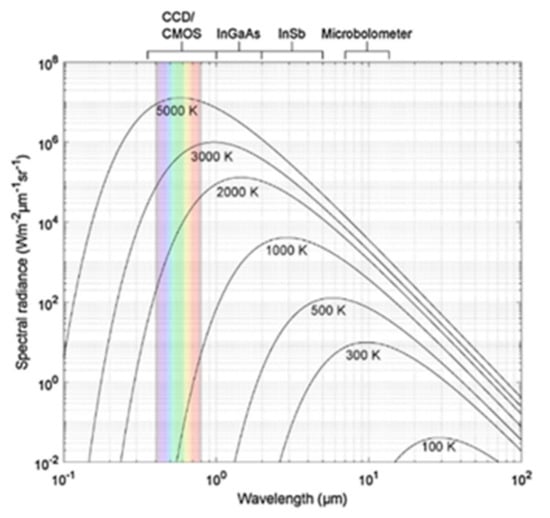 where is the spectral radiance as a function of wavelength () and temperature (T), h is Planck’s constant, c is the speed of light in a vacuum, and is Boltzmann’s constant. Figure 6 illustrates the spectral dependence of blackbody emission as a function of temperature.