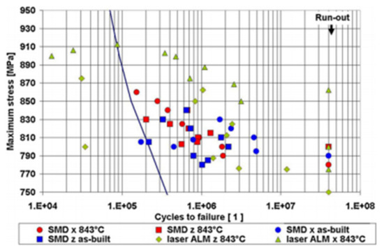 - Sterling, A.J.; Torries, B.; Shamsaei, N.; Thompson, S.M.; Seely, D.W. Fatigue behavior and failure mechanisms of direct laser deposited Ti–6Al–4V. Mater. Sci. Eng. 2016, 655, 100–112. [Google Scholar] [CrossRef]