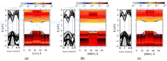 Ab-initio-calculated band profiles, obtained for 24AlN-12GaN atomic layers supercell with periodic boundary conditions: left panel—momentum space, right panel—real space. The blue line represents electric potential profile presented as electron energy: (a)—zinc blende, (b)—hexagonal, (c)—wurtzite structure. The GaN lattice was used in the entire system, by mere location of Ga and Al atoms in the lattice sites without relaxation.