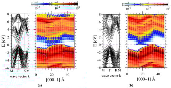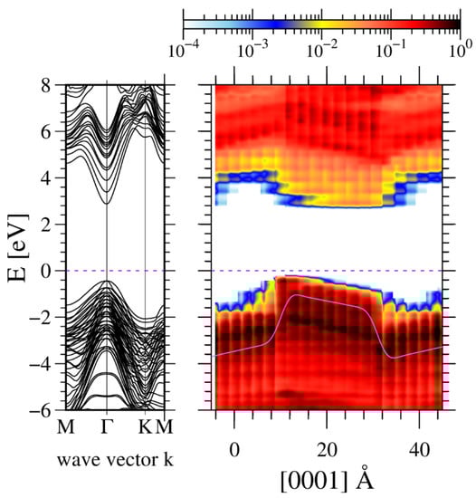 In order to determine the polarization difference directly, the GaN/AlN and InN/GaN MQWs were calculated by ab initio methods. First, the AlN-GaN periodic structure was calculated. The structure consists of eight atomic layers of GaN and eight atomic layers of AlN (8GaN-8AlN). The ab-initio-obtained band structure is presented in Figure 3.