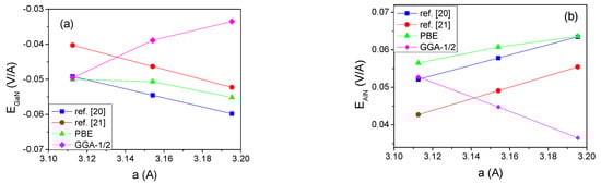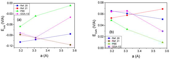 Electric fields in the well (a) and barrier (b) in 8AlN-8GaN atomic layers superlattice for various values of a lattice parameter a. The data denoted as refs. [20,21] were calculated using the values listed in Table 1 via Equation (3); the data denoted PBE and GGA-1/2 were obtained from ab initio electric potential using these two approximations.