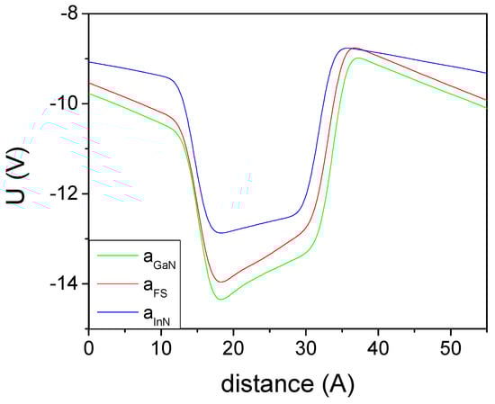Electric potential profiles, obtained for 12GaN-6InN atomic layers superlattice using GGA-1/2 approximation. The line represents: GaN—structure strained to GaN, a lattice constant; FS—freestanding lattice; InN—structure strained to InN, a lattice constant.