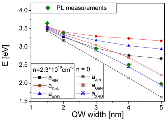 XRD measurements were also used to determine lattice parameter a of the GaN/AlN MQWs, which was extracted from the RSMs of the (−1−124) reflection. These data were used in the ab initio simulations of GaN/AlN MQWs to obtain the energy difference between the conduction and valence band states, which are presented in Figure 9. They were compared with the PL results.