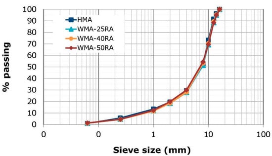 All mixtures had almost the same grading, as shown in Figure 1, and optimum bitumen content 4.8% by aggregate weight, and the design air voids ranged between 9 and 10.5%. Various forms of polymer modified bitumen (PmB), designated in terms of their penetration range at 25 °C (e.g., 25/55 pen) and softening point lower limit value (e.g., ≥75 °C) according to EN 14023, were used. Specifically, a PmB graded as 25/55-75 was used for the HMA mixture, whereas a softer PmB graded as 45/80-65 was used for the WMA-RA mixtures to compensate for the aged bitumen of RA materials. To lower the production temperatures of recycled mixtures relative to the HMA, the latter bitumen was mixed with a synthetic paraffin wax additive, at the percentage of 1.5% (by weight of virgin binder), manufactured from natural gas using the Fischer–Tropsch method, which is completely soluble in bitumen above 90 °C and significantly reduces the viscosity of the resulting bitumen blend (i.e., WMA bitumen). For each mixture, loose samples were prepared using laboratory planetary equipment. After mixing, the loose materials of HMA and WMA-RA mixtures were short-term conditioned for 4 and 2 h, respectively, at the planned respective compaction temperatures of 160 and 130 °C. More detailed information about the mixture properties and specimen preparation can be found in a study published by Georgiou and Loizos [28].