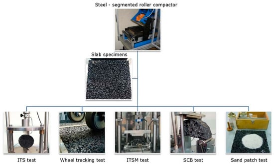 To fully characterize the mixtures’ performance, both mechanical and functional properties were evaluated, namely, moisture susceptibility, rutting resistance, stiffness modulus, fracture resistance, and surface macrotexture. For specimen fabrication, a steel-segmented roller compactor was used, which is believed to realistically reproduce the field compaction conditions and enables accurate assessment of the on-site characteristics of field compacted asphalt mixtures [29,30,31]. Laboratory specimens were compacted with the aim of achieving a 97% degree of compaction (corresponding to 12–13% air voids).