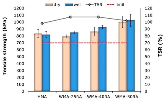 Figure 3 shows the ITS in wet and dry conditions, in addition to the TSR values, for each mixture.