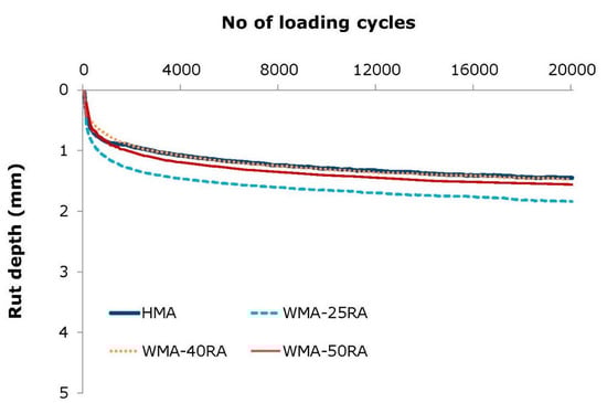 The rut depth for all mixtures, as a function of the number of loading cycles, is shown in Figure 4. Moreover, Table 2 shows the corresponding main parameters that characterize their rut resistance at 60 °C.