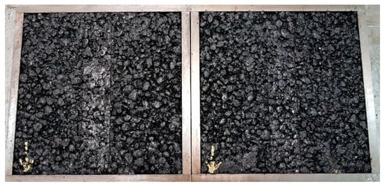 The surface macrotexture of the asphalt mixtures was assessed by employing an experimental, practical-oriented approach, as introduced in an earlier study [35]. This approach includes the fabrication of laboratory asphalt slabs using a steel-segmented roller compactor and macrotexture measurements using the typical sand patch test method. Two measurements were performed, namely longitudinal and lateral to the compaction direction, and averaged to obtain the mean texture depth (MTD) value. Based on this approach, good estimates of the field texture depth were achieved, which subsequently enabled optimization of the texture characteristics of the asphalt mixtures during the mix design process.