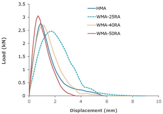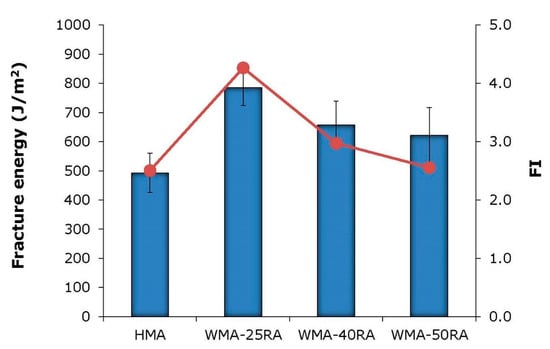 Based on the Gf results, the HMA showed the most brittle behavior. Gf represents the energy dissipated by the crack propagation; thus, the higher the fracture energy, the better the cracking resistance of the asphalt mixtures. On the contrary, all warm recycled mixtures exhibited higher fracture energy values than the control mix, by 26–59%. Similar findings were derived from the FI results. Regarding the recycled mixtures, the fracture energy decreased with increasing RA content, and the WMA-25RA mixture exhibited superior fracture properties. In addition, the flexibility index decreased with increasing RA, which may be expected because the amount of aged bitumen increased with increasing RA.