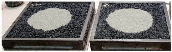 Sand patch tests were performed on roller-compacted asphalt slabs, as illustrated in Figure 9. The macrotexture test results of the mixtures studied are shown in Figure 10.