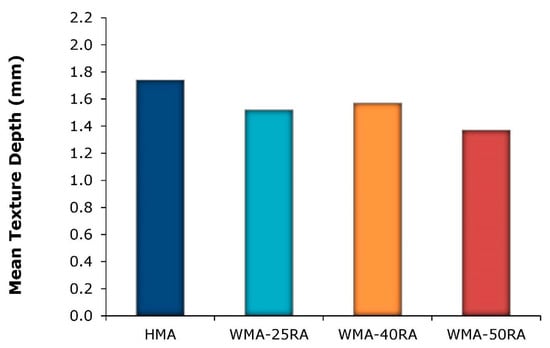 The results indicate that the HMA and the WMA with 40% RA exhibited the highest texture depths. On the contrary, the lowest texture corresponded to the WMA with 50% RA. Taking into consideration that the same compaction energy was applied to all mixtures, the closer texture of some recycled mixtures may be attributed to their better workability and compactibility properties, which resulted in denser aggregate packing [28]. However, it has been demonstrated that the surface macrotexture achieved in the field is also related to the construction techniques, and the steel-segmented roller compaction method enables the efficiency of field compaction modes in achieving satisfactory texture levels to be simulated and evaluated [35]. In this respect, future work will focus on deter-mining the field compaction mode that optimizes the resulting surface texture properties of the studied mixtures.