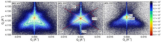 The DS has a wings-like regular shape and its intensity is focused along the 55° angle with respect to the [001] direction. This corresponds very well with the value of 54.7°, which is typical for the stacking faults (SF)—planar defects localized in {111} planes [29]. The intensity of streak-like stacking faults is mostly focused at lower values of Qz with respect to GaSb reciprocal lattice point. According to e.g., [30,31,32], different types of defects can cause a shift of diffuse scattering intensity along the Qz axis: interstitial defects—to positive values and vacancies—to negative values of Qz. Therefore, it can be concluded that apart from stacking faults, there are also vacancies present in the investigated #SL200, #SL300, and #SL400 superlattices. Different intensity distributions of DS caused by stacking faults were observed for investigated superlattices. For #SL300 DS is mostly focused around 004 reciprocal lattice point in both Qx and Qz directions. For #SL400 and #SL200, the wings of DS are more elongated in the direction of smaller Qz values, and the widening in the Qx is also more pronounced than for #SL300. The analysis of defects, which are responsible for different shapes and distributions of DS is presented in the following subsections.