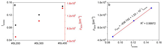 The defect density (ρSEM) was calculated by counting all flat defects and dividing their number by area corresponding to the SEM image field of view shown in Figure 4a. The tilt angle was taken into account. Calculated ρSEM values of 1.42 × 106 cm−2 for #SL400, 1.01 × 106 cm−2 for #SL300, and 0.51 × 106 cm−2 for #SL200 are presented in Figure 3a (red points). The same as for Iexcess(number of periods) function, the value of defect density increases with the number of periods in the superlattice. Additionally, a linear dependence between ρSEM and integrated intensity was observed (Figure 3b). Even though the #SL300 was grown at a higher temperature than other samples, no correlation between the number of defects and the growth temperature of the superlattice was observed at this stage.