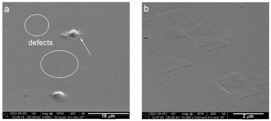 The SEM characterization was also carried out within the scope of the simple defect analysis. Obtained images revealed a few by few micrometers in size, rectangular-shaped defects on the surfaces of investigated superlattices. Examples of these, found on the surface of #SL400 are shown in Figure 4. The majority of the defects were flat (in circles in Figure 4a) and some of them had precipitates in their centers (marked by an arrow in Figure 4a). The former are shown under higher magnification in Figure 4b. The defect size estimated from SEM images is (2.5–3) μm × (2.5–3) μm for #SL200 and #SL400, and (3.2–3.4) μm × (3.7–3.9) μm for #SL300.