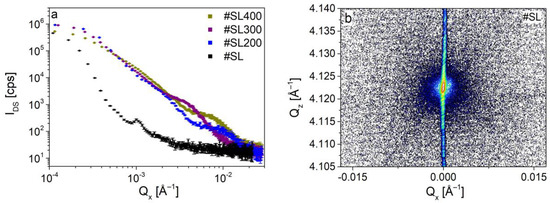 In this subsection, a detailed investigation of diffuse scattering intensity (IDS) by analyzing the log-log plot of IDS (Qx) is presented. For this purpose, the cross-sections of DS surfaces along Qz for different values of Qx were created for investigated superlattices. Obtained curves including one for the reference sample are shown in Figure 5a.
