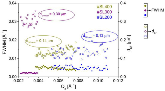 The widths of stacking faults along the streak for studied superlattices are nearly constant, (full circles in Figure 7). The SF diameters were calculated using (3) (open circles in Figure 7), after which the average values for each sample were determined. The largest stacking faults with the average size of 0.30 μm were present in #SL300, while twice smaller of 0.14 μm and 0.13 μm were in #SL400 and #SL200, respectively.