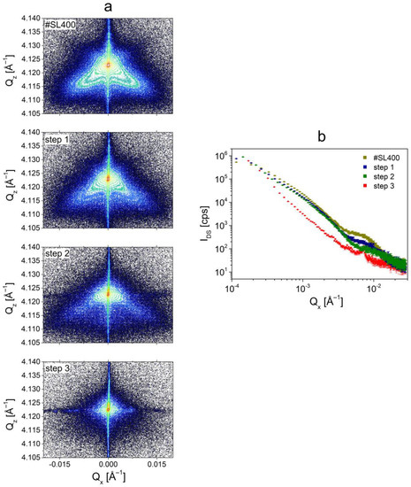 The methodology described in the previous subsection was also employed in this case. The decrease of diffuse scattering intensity in the range of Qx corresponding to the stacking faults for structures marked as step 1 and step 2 was observed (Figure 8b). Furthermore, for the step 3 designated sample the IDS associated with stacking faults vanished. It was also observed that the diffuse scattering intensity for ~3.7 × 10−4 Å−1 < Qx < ~3.7 × 10−3 Å−1 was about 3–5 times smaller than for #SL400, step 1, and step 2 samples. For these three, a small decrease of intensity occurred with each etching in the aforementioned Qx range.