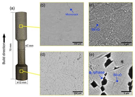 Figure 2b,c, the top area of the fabricated specimen featured different microstructure morphology compared with the bottom area. A fine lamellar B2 + O microstructure can be seen at high magnifications (