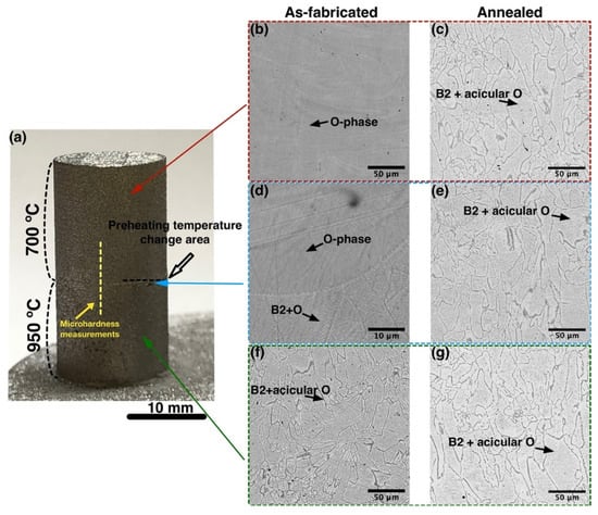 Figure 3c–g) with equiaxed B2 grains and fine acicular O-phase precipitates similar to the microstructure of the sample fabricated at 950 °C platform preheating. No significant differences in microstructures of the bottom, top, and transition areas of the sample were found, suggesting that heat treatment eliminated microstructural inhomogeneity of the alloy. At the same time, microhardness measurements of the annealed sample showed an even distribution of the values along the build direction. After heat treatment, the microhardness decreased to 340 ± 20 HV