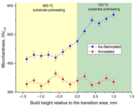 Figure 4) along the build direction showed a steep increase in microhardness values along the transition zone, as the fully-O microstructure is characterized by higher hardness (about 560 HV