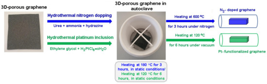The nitrogen functionalization of three-dimensional (3D)-porous graphene was conducted using the hydrothermal method. The experiments were carried out in a 1000 mL Teflon HYD-1000 autoclave from Tefic Biotech (dft technology GmbH, Postfach, Neumünster, Germany). Three different urea concentrations were used to obtain different (3D)-porous graphenes: 0.2135 g (GrFoam1N), 0.4144 g (GrFoam2N), and 0.6405 g (GrFoam3N), respectively, that were dissolved in 80 mL DW. The urea solution was stirred for 5 min, while ammonia was dropped until the pH reached 10. Subsequently, 2 mL of hydrated hydrazine was added as reducing agent, and afterwards the solution was introduced into the autoclave [14]. In order to prevent the graphene foam from breaking, a special Teflon support was designed for its slow diving and supporting during the hydrothermal process. The next step was to keep the autoclave in an oven at 180 °C for 3 h, in static conditions. In order to stabilize the nitrogen within the graphene matrix, after completely cooling, the samples were introduced in a nitrogen-controlled oven and kept for 1 h at 200 °C, and then for 3 h at 600 °C (Figure 1). The inclusion of Pt into the graphene foam matrix was carried out in the same autoclave by soaking 0.0358 g of graphene into 80 mL of ethylene glycol for 1 h [14]. Then, the graphene foam was removed from the Teflon vessel, and a solution containing 10.36 mg of dihydrogen hexachloroplatinate (IV) hydrate and 3 mL DW was added gradually. The pH of the mixture was adjusted to 11 by adding 2.5 M sodium hydroxide. Next, graphene foam was introduced into the solution and treated for 6 h at 120 °C. Lastly, the Pt-embedded graphene foam (GrFoamPt) was washed with DW and dried for 6 h at 80 °C under vacuum (Figure 1). The same procedure was applied for incorporating Pt into the GrFoam1N to obtain the GrFoam1NPt sample.