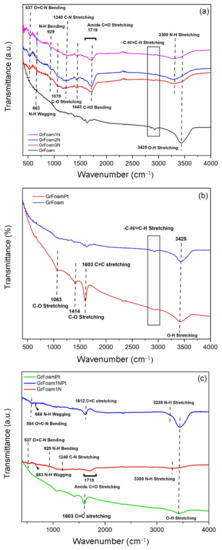 The overlaid FTIR spectra of: (a) GrFoam1N, GrFoam2N, and GrFoam3N; (b) GrFoamPt; (c) GrFoam1N and GrFoam1NPt, in comparison with pristine GrFoam.