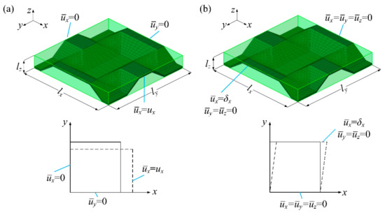 Take the example of calculating the elastic modulus and shear modulus for the equivalent core model of the BTS panel. To ensure the simulation accuracy, for uniaxial tension numerical simulation, the paper takes 21 RVEs in the length direction of the tension model and three RVEs in the width direction; for shear numerical simulation, six RVEs were taken in both the length and width directions. In order to easily observe and analyze, only one RVE is shown in the Figure 2 to describe the boundary conditions of the uniaxial tension and shear simulation. For uniaxial tensile and shear numerical simulations, the plane subjected to displacement constraints is coupled to a reference point by Equation, and a tensile or shear force is applied to the reference point to cause tensile or shear deformation to occur. and of the equivalent core model can be obtained from Equations (1) and (2) respectively; can be acquired by Equation (3). , , , , and can also be obtained using the equations similar to Equations (1)–(3) by uniaxial tension and shear numerical simulation of the mesoscopic core structure, where x, y, z represent the elastic principal axes of the mesoscopic core model.