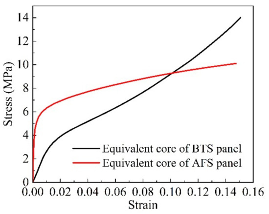 - The core layers of the BTS panels and AFS panels were equated to an orthotropic single-layer panel, and the elastic parameters, anisotropy parameters, and equivalent stress-strain curves of the equivalent model of the sandwich panel were obtained by numerical simulations of uniaxial tension and pure shear of the mesoscopic model of the sandwich panel.