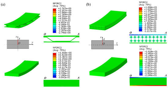In order to verify the validity of the elastoplastic equivalent model of the sandwich panel, this paper compares the average stress value of the characteristic sections at the same position of the mesoscopic model and the equivalent model. The section average stress value is calculated by dividing the sum of the absolute values of the nodal forces perpendicular to the section of all nodes in the section by the corresponding cross-sectional area. For cylindrical forming numerical simulations of the BTS panel and AFS panel with a forming radius of 600 mm, this paper investigates the average stress at the OA section position, and the average stress values of the OA section are obtained from the numerical simulation results of their mesoscopic models and equivalent models. Figure 6 shows the nodal force distribution at the OA section location.