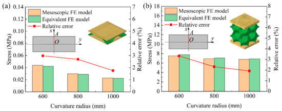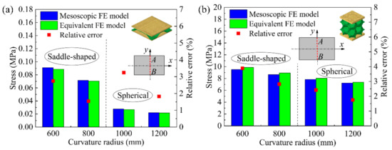 Figure 7 shows the comparison results of the numerical simulation results of the average stress at the symmetrical section OA of the mesoscopic model and the equivalent model of the BTS panel and the AFS panel with different cylindrical forming radius. From Figure 7a, it can be seen that the average stress in the section of the equivalent model of the BTS panel is slightly lower than that of the mesoscopic model at the same forming radius. As the forming radius increases, the average stress in the section of the mesoscopic model and the equivalent model gradually decreases. The relative error of the section average stress of the equivalent model and the mesoscopic model is gradually reduced with the forming radius, and the maximum relative error and minimum relative error are 2.97% and 1.75%, respectively. It can be seen from Figure 7b that the section average stress of the mesoscopic model and the equivalent model of AFS panel and the relative errors of the section average stress vary with the forming radius in the same trend as that of the BTS panel, but the section average stress of the equivalent model of AFS panel is slightly larger than that of the mesoscopic model, and the maximum relative error and the minimum relative error are 3.33% and 1.92%, respectively. By comparing the average stresses in the section of the mesoscopic model and the equivalent model of the above two sandwich panels, it shows that the equivalent model of the sandwich panel has good accuracy under the cylindrical forming type.