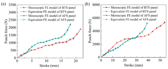 Figure 10 illustrates the load-stroke curves of the mesoscopic model and the equivalent model of sandwich panels with different shapes. As can be seen in Figure 10a,b, the load-stroke curves of the mesoscopic model and the equivalent model of the BTS panel and the AFS panel with the same shape are basically the same, which proves that the equivalent model of the sandwich panel all have high forming accuracy with different forming types.