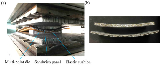 In order to obtain BTS panels and AFS panels with three different shapes: cylindrical, spherical, and saddle-shaped, this paper uses multi-point forming (MPF) technology to carry out plastic forming experiments on sandwich panels [28,29]. MPF technology is an advanced sheet forming technology, which replaces the traditional die with a regular array of punch points and forms a flexible die with variable shape by computer control of punch positions, thus realizing rapid sheet forming, which not only reduces the die manufacturing cost but also saves time. The multi-point die punch element is a hemisphere with a radius of 10 mm, and the face sheet and core materials of the BTS panel and the AFS panel are shown in Table 3. The dimensions of the sandwich panels used in the MPF experiments are the same as the dimensions of the mesoscopic FE models of the sandwich panels during the numerical simulation. Figure 11a shows the experimental process of MPF of sandwich panels.