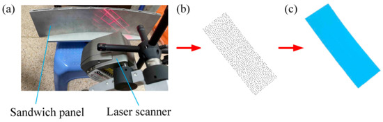 Surface reconstruction process of sandwich panels. (a) 3D scanning; (b) point cloud data; (c) reconstructed surface.