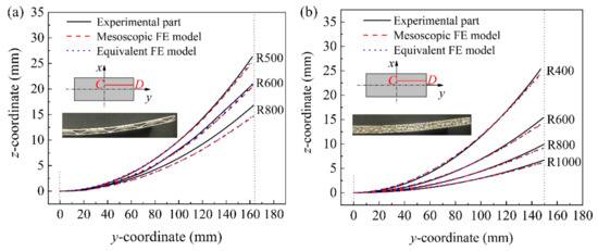 Figure 13 shows the comparison results of the longitudinal section of the upper face sheet after springback of the experimental and simulated parts of the BTS panel and AFS panel with different cylindrical-forming radius. Due to the symmetry of the sandwich panel, half of the sandwich panel in the long axis direction is taken as the research object. The location of the extracted profile is located at 20 mm from the center of the y-direction on the right half of the cylindrical bending direction. Figure 13a shows the comparison results of the cross-sectional profiles of the upper face sheet of the experimental and simulated BTS panel with a cylindrical forming radius of 500, 600, and 800 mm. It can be seen from Figure 13a that the cross-sectional profile of the equivalent model and the mesoscopic model of the BTS panel basically overlap, and the cross-sectional profile of the equivalent model and the experimental part overlap near the center, and the springback of the equivalent model of the sandwich panel is slightly larger than that of the experimental part at the edge position, thus the deviation of the cross-sectional profile becomes larger. Figure 13b shows the comparison results of the cross-sectional profile of the upper face sheet of the experimental and simulated parts of the AFS panel with a cylindrical forming radius of 400, 600, 800, and 1000 mm. As can be seen in Figure 13b, the upper face sheet cross-sectional profile of the equivalent model of the AFS panel overlaps highly with the mesoscopic model and the experimental parts. The result shows that the equivalent model of the sandwich panel has high forming accuracy.