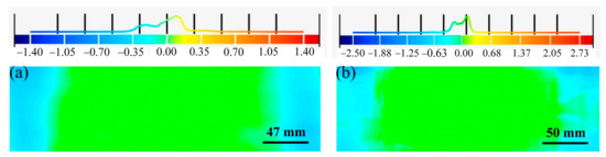 For the analysis of a cylindrical sandwich panel with a radius of 600 mm after springback, the shape errors of the upper face sheet of the equivalent model of the sandwich panel in the normal direction were measured by taking the upper face sheet of the experimental part as the reference surface, as displayed in Figure 14a,b. The shape errors of the equivalent models of BTS panels and AFS panels are −1.40 to 1.40 mm and −2.50 to 2.73 mm, respectively. All the results show that the shape errors of the equivalent models of the two sandwich panels are very small, indicating that the equivalent models of the sandwich panels have high forming accuracy.