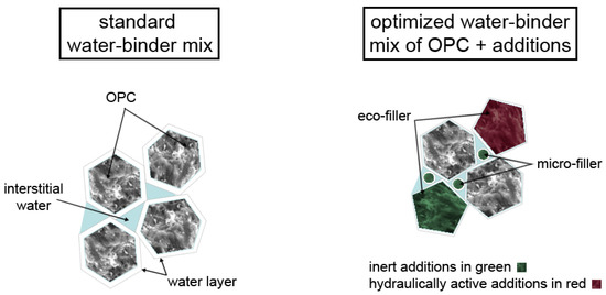 The performance-based mix design follows a stepwise approach: (i) suitable source materials selection, (ii) binder design with paste experiments by the micro-filler/eco-filler concept including tests to determine the compatibility of binders and additives and (iii) final development (upscaling) of the concrete mix as well as its performance proof in terms of workability, strength and durability. The general approach of optimizing binder composition is illustrated in Figure 1. The methodology is based on the optimization of packing density and minimization of water demand especially of the powders that form the paste (i.e., all granular materials with a maximum grain size < 125 µm) bearing in mind their environmental impact [19]. In an optimized paste OPC with its high GWP and PEt is partly substituted by properly selected very fine micro-fillers (MFs) and coarser eco-fillers (EF) that have low water demand and lower environmental impact. Both fillers can be hydraulically active or inert, so the physical filler effect as well as the potential latent-hydraulic or pozzolanic reactivity are to be considered in the mix design. Former studies [20,21] showed that a physical filler effect can be achieved by a size ratio of smaller particles to larger particles (i.e., MF to EF and OPC) dMF/dEF/OPC ≤ 0.33 with an optimum reached at a ratio ⋍0.1. Practically MFs have a d50 < 3 µm in any case, significantly smaller than OPC. The physical filler effect increases the packing density of the mix and helps to accelerate hydraulic reactions inter alia by its nucleation effect and higher specific surface area (SSA) [22,23]. In this study, MFs are properly selected limestone (LS) or dolomite powders and EF are LS powders or GGBFS as pointed out in detail in Section 2.1. Eco-pastes typically have a decreased w/bt ratio (water/total binder ratio) but the same or an even higher w/bh ratio (water/hydraulically active binder ratio) compared to pure PC pastes. In general, their portion of clinker is reduced and thus their w/c ratio (water/clinker ratio) increases.