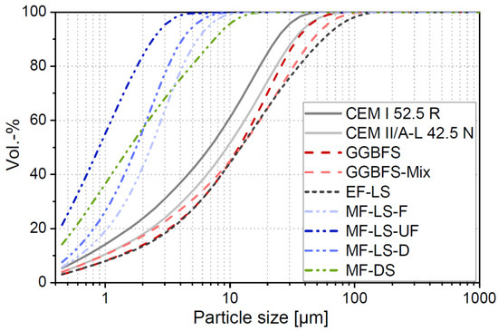 Particle-size distribution of the investigated binder materials.