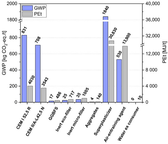 A surfactant-based air entraining agent (AEA) and 4 different PCE-based superplasticizers depending on the binder and their compatibility were used. The powder materials were characterized including the determination of (i) dry particle density according to ÖN EN ISO 1183-1 [26], (ii) Blaine surface according to ÖN EN 196-6 [27], (iii) BET surface according of DIN ISO 9277 [28], (iv) particle-size distribution (PSD) carried out by a laser granulometric measurement (Sympatec Helos/Rodos with dry dispersion, result shows the mean value of 3 tests, with an measuring range between 0.45 and 875 µm), and (v) environmental indicators (PEt and GWP, see Section 2.2). The results are presented in Table 1 and Figure 2. The d50 value given in Table 1 is calculated from the PSD analysis and describes the particle size that 50 Vol.-% of the particles fall below. Characterization of the effectiveness and compatibility of SP´s to the different binder combinations was carried out by a compatibility check, which is explained in Section 2.3.2.