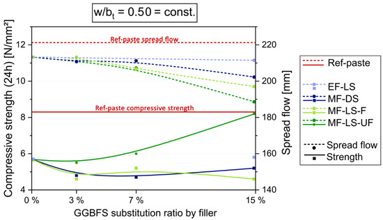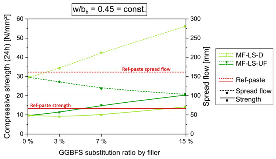 For further optimization, the workability and early strength had to be adjusted with increasing MF content. For the first purpose, either suitable SP or an MF with plasticizing effect, i.e., MF-LS-D, could be used. For the latter purpose, w/b ratios can be reduced. Note that, in our case, no (fluid) SP was added in all the paste experiments, as this measure was reserved for further concrete development. Figure 5 shows the comparison of the effect of the stepwise substitution of GGBFS in the basic Eco-paste by MF-LS-UF and MF-LS-D at w/bh = 0.45 = const. That means water content (and w/bt) is reduced with greater GGBFS substitution rates by inert LSP. For 15 wt.% of MF-LS-UF a doubling of the 24 h strength, but with negative influence on workability is achieved. However, an increased usage of MF-LS-D also results in increasing early strength while at the same time improving the workability. With an MF-LS-D content of 15%, an increase in early strength is achieved that is above the Ref-paste strength (14.2 N/mm2 > 13.3 N/mm2) while far exceeding its flowability (280 mm > 161 mm).