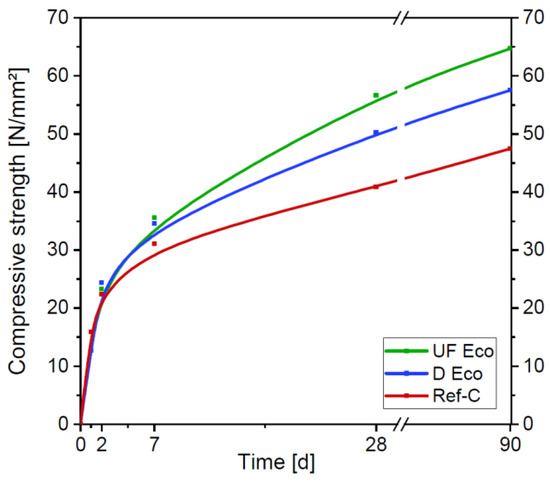 Compressive strength development of the Eco-concretes compared to Ref-C.