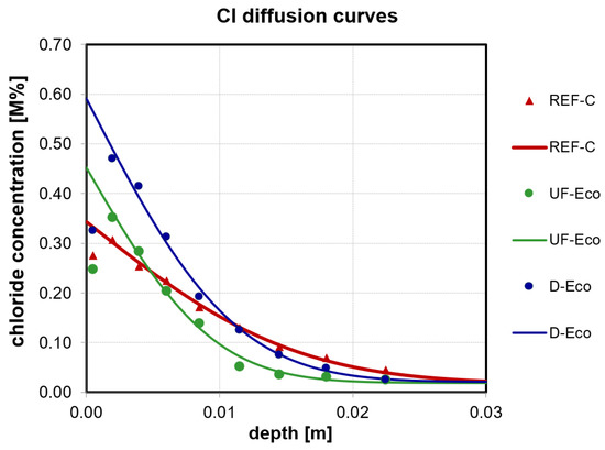 As there is no limit value specified for the chloride diffusion coefficient as determined herein in the Austrian or another applicable European Standard, the results of the eco-concretes were referred to mixture Ref-C. The eco-concretes show slightly improved chloride resistance as their Dnss is lower (UF = 3.6 × 10−12 m2/s; D = 5.0 × 10−12 m2/s) than the Dnss of Ref-C (9.7 × 10−12 m2/s) (see Figure 8).