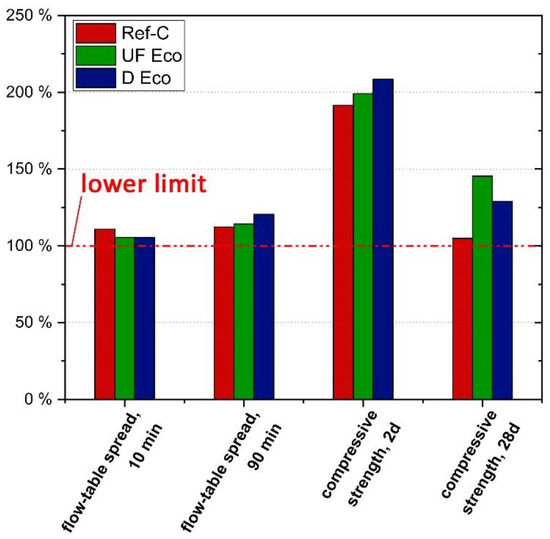 Figure 9 shows that the workability and strength of all concretes exceed the standard requirements as expected. It is remarkable that the consistency, i.e., the flow-table spread of the Eco-concretes exceeds that of Ref-C even after 90 min, despite their lower w/bt value. The main reason for the good workability is the appropriate choice of type and dosage of SP. However, D Eco surpasses the limits after 90 min clearly, which means, SP dosage could be reduced a bit, especially regarding the “consistency keeping” part of the SP-mix.