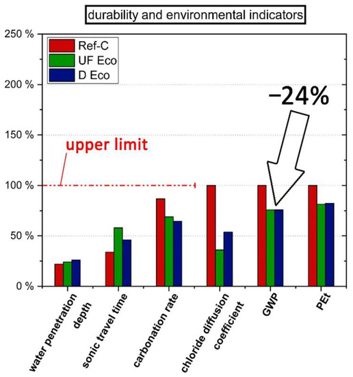 In terms of durability properties (Figure 10), all concretes are below the limits of the requirements given in standards in those cases where they exist. In terms of carbonation rate, Eco-concretes perform better than the standard normal concrete. This shows that even clinker-reduced concretes can have a very high carbonation resistance if the mix-design is suitable. There are no normative limit values for the chloride diffusion coefficient. However, it can be seen that the Eco-concretes with high content of GGBFS have a higher resistance than standard concrete. Such durability increases result in a prolonged lifetime, improving even more the LCA. Although such lifetime multiplier is not considered in the actual approach the aim of improving ecological performance is already achieved. GWP of Eco-concretes was reduced up to 24% and PEt up to 18% compared to Ref-C (Figure 10). It can be expected that further reductions in GWP and PEt are achievable if the performance of Eco-concrete is tailored even more precisely to the required limits in terms of functionality and durability.