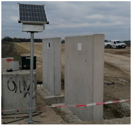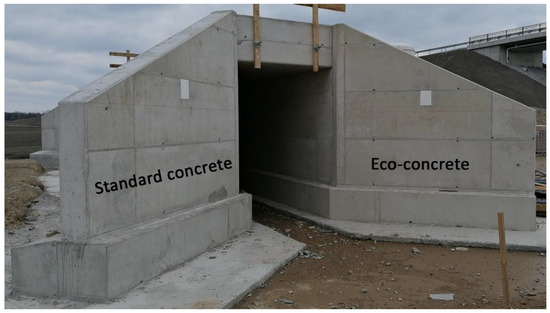 In the course of execution, Eco concrete was produced in a conventional mixing plant for ready-mixed concrete and then delivered by truck mixers in the same way as standard concrete. Both concretes were placed shortly after each other (1–2 h) in the planned construction sections, which were foundations, walls and the ceiling. In addition, two mock-up-walls (see Figure 12) made of the two different concrete types were produced to allow for further investigations (sample taking and instrumented monitoring). Proper curing was applied for one week to prevent concrete from rapid desiccation.