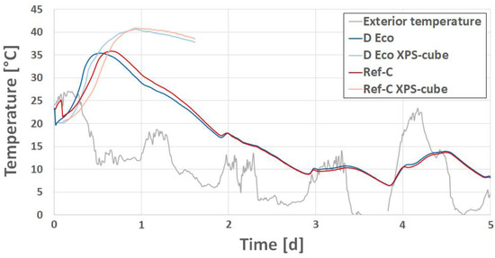 Hydration heat development within the mock-up walls and additional concrete cube specimens as well as environmental temperature during the first 5 days.