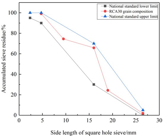 RCA: obtained from the original concrete with C30 strength grade after standard curing for 28 days according to the standard for test methods of mechanical properties of ordinary concrete (GB/T50081-2002), then crushed and screened by a jaw crusher. Its particle size is between 4.75 mm and 26.5 mm, and its grain composition is shown in Figure 2, which meets the requirements of RCA quality evaluation standard (GB/T25177-2010). Among them, the cement used in the original concrete is ordinary Portland cement of P.O. 42.5 grade of Shanshui Group, the coarse aggregate is granite macadam with the grain size of 5–25 mm, the fine aggregate is river sand produced in Pingdu, Qingdao with fineness modulus of 2.5, the water reducing agent is polycarboxylate superplasticizer with water reducing rate of 25%. The mixing ratio of the original concrete and the compressive strength of the 28 d cube are shown in Table 1.