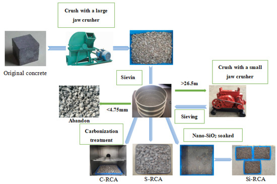 Preparation process of recycled coarse aggregates (RCA): S-RCA–simple crushed of original concrete, C-RCA–simple crushed and carbonization treatment, Si-RCA–simple crushed and nano-SiO2 solution soaking.