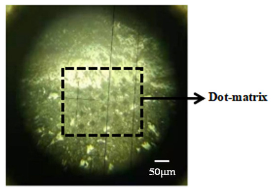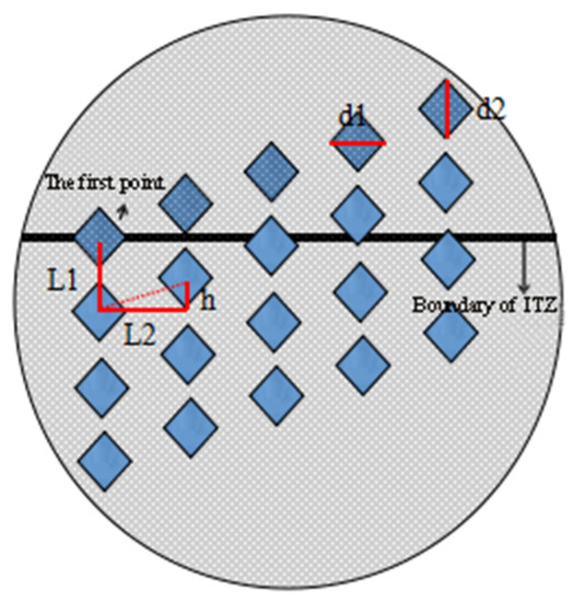 In order to reduce the discreteness of micro-hardness values, firstly, three kinds of ITZs were found near the same aggregate, and secondly, nine lattices were tested in each ITZs, each lattice contains 4 × 5 measuring points. In order to avoid the overlapping phenomenon of adjacent indentations, the test load was determined to be 50 g, and the longitudinal distance L1 and horizontal distance L2 of two adjacent indentations are both 50 μm. In order to visually observe the change of micro-hardness value at the ITZs, the vertical height difference h between two adjacent indentations in the transverse direction was determined to be 10 μm, and we made sure that the first point of the lattice was on the boundary of the interface [22,23]. The schematic diagram of micro-hardness dotting is shown in Figure 4, and the actual dotting diagram is shown in Figure 5.